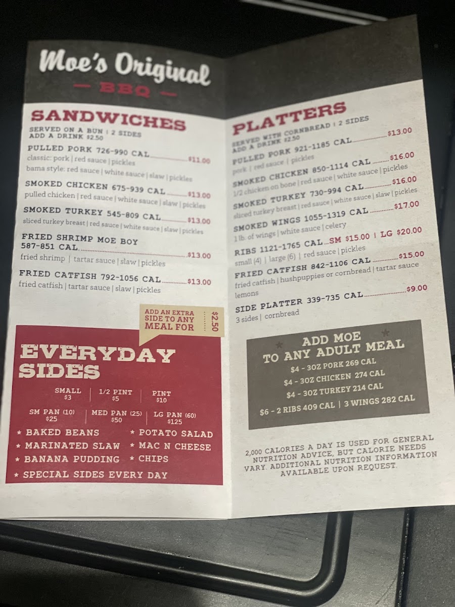 Complement your meal with homestyle sides, including cornbread and mac and cheese, praised for their delightful textures and flavors. With welcoming service and reasonable prices, a visit to Moe's is a must for BBQ enthusiasts and newcomers alike!
